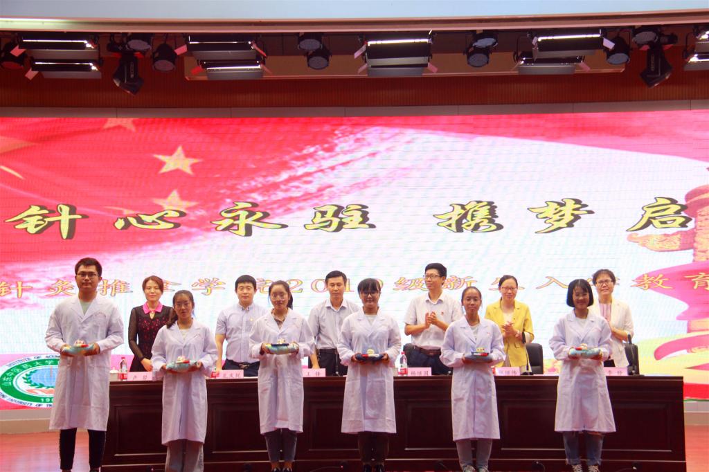 宣誓结束后,学院领导为新生代表颁发礼物——《针灸推拿学专业必背经典文献》、针具、米袋、针包。