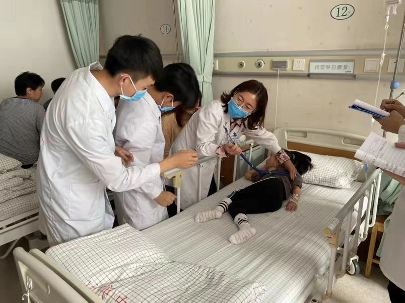 调研第一站,是走入相关科室,了解学生的授课情况。在潍坊市中医院中医儿科病房内,一位诊断为支原体肺炎的患儿肺部出现了湿啰音,这是肺炎的典型体征之一。但是,带教教师王颖在指导完学生听诊后,却详细询问了与哮喘有关的病史与家族史。