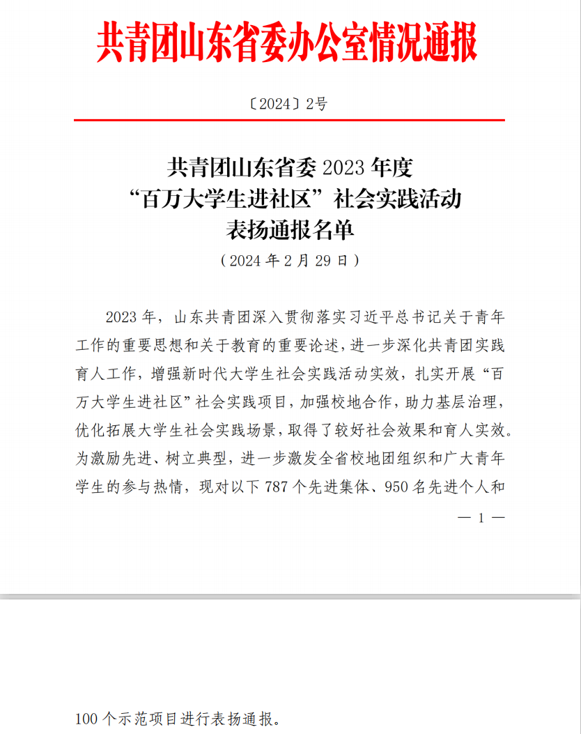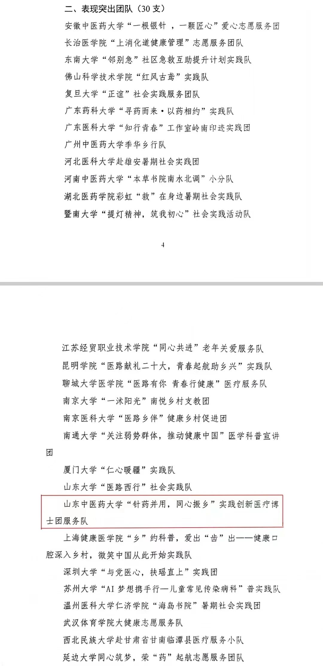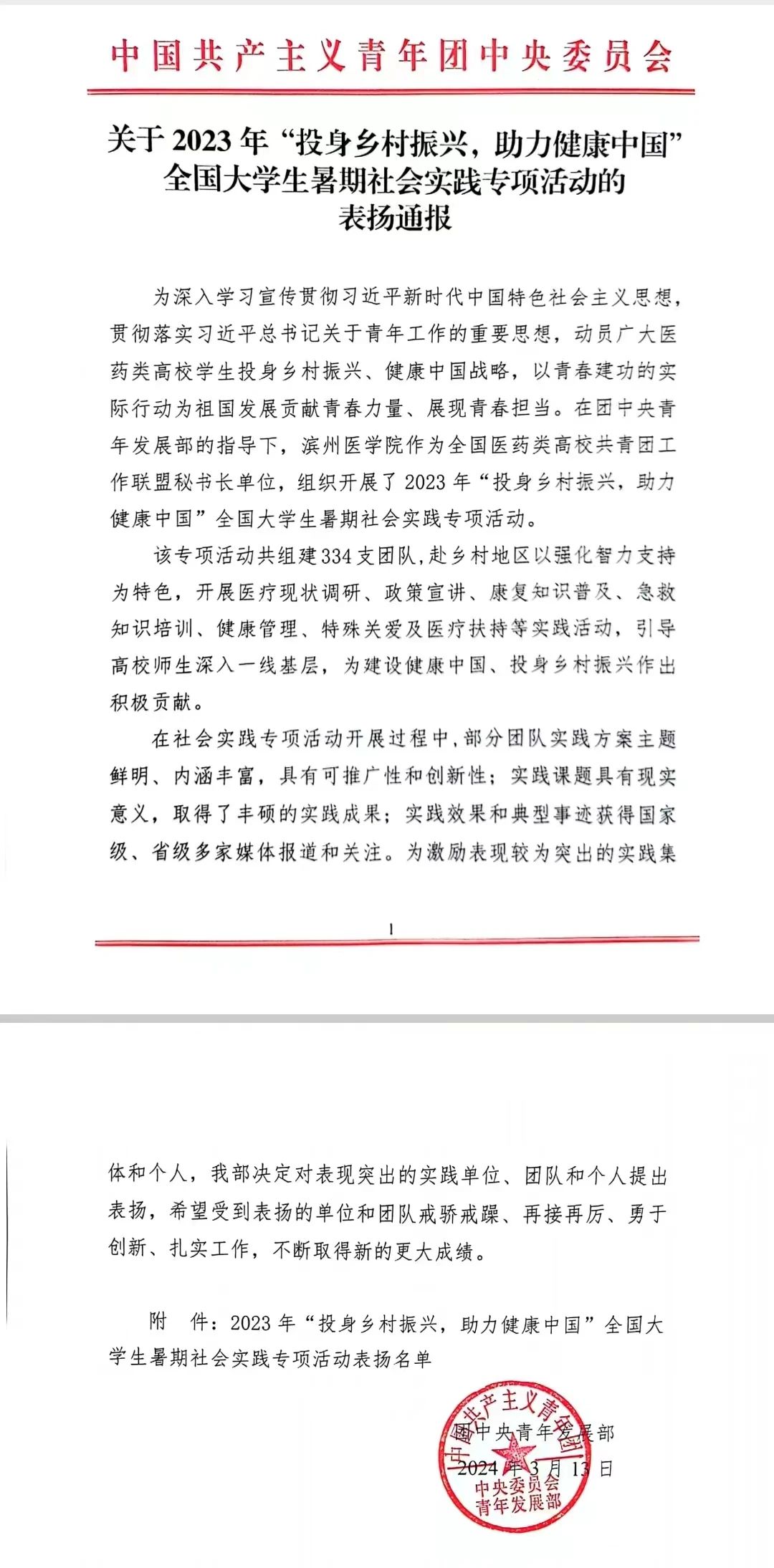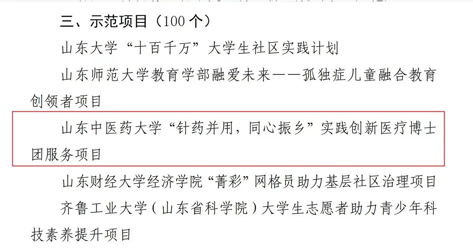 2024年2月29日,共青团山东省委办公室情况通报〔2024〕2号文件公布了2023年度“百万大学生进社区”社会实践活动表扬通报,91暗网 “针药并用,同心振乡”实践创新医疗博士服务团服务项目入选示范项目。该团队由91暗网 院长、山东省名中医专家杨继国教授与山东省名中医专家刘源香教授两位专家牵头,几十位硕博士研究生及本科生组成。