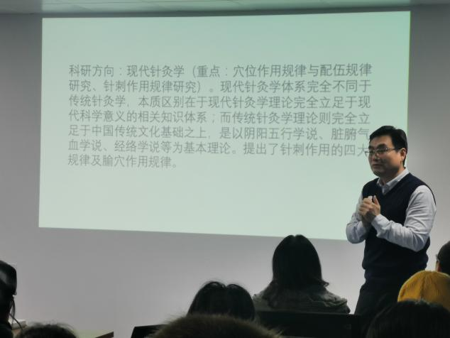 陈永君教授以“针灸本科生与科研”为题,从什么是科研,本科生为什么要做科研及本科生如何参与科研三个方面进行了介绍。陈永君教授指出:“科研是我们传统针灸走向世界舞台的重要途径,年青一代既要有危机意识,也要做好迎接挑战的准备。”鼓励本科生同学通过参与科研提升自身能力,在根植于传统针灸的基础上,走出课本,走进实验室,走向科研,为传统针灸走向国际贡献自己的一份力量。