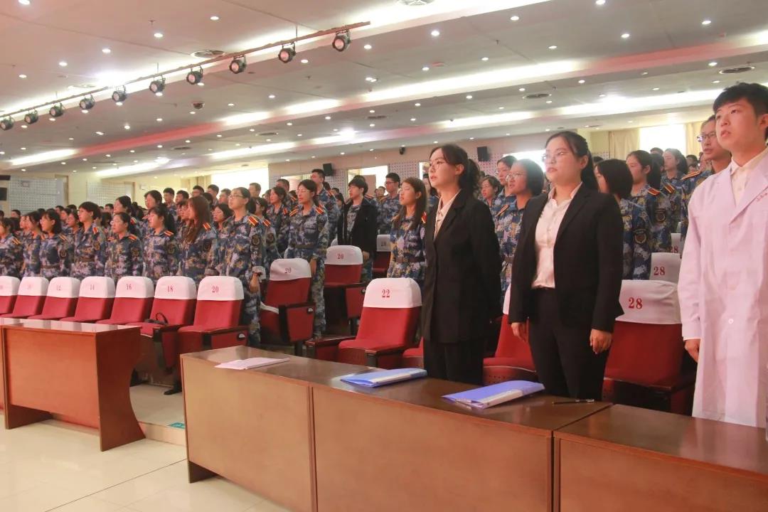 会议开始,全体起立奏唱中华人民共和国国歌。随后,由刘珂华同学领誓,全体新生进行入院宣誓。掷地有声的誓言提醒即将步入神圣医学殿堂的学子们医学的神圣和伦理道德的重要,大医精诚的精神在此得以传承。