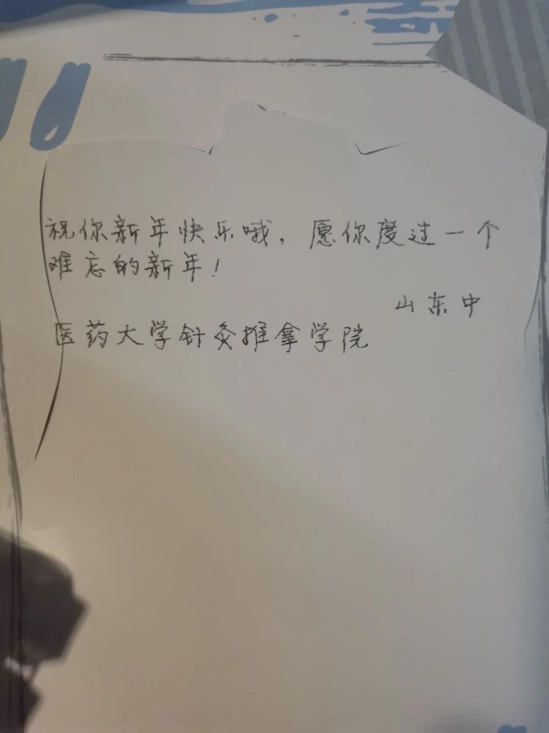 ——“本以为‘就地过年’只是一件小事情,却不曾想得到了学院领导的重视。就在小年前一天,我一如往常一样在医院工作,突然接到了导员打来的慰问电话,她给我送来了学院领导的关心与慰问。老师温柔的声音,已让我倍感温暖。上了一天班后回到宿舍又收到了学院的慰问品,心中除了温暖更多的还有感激。