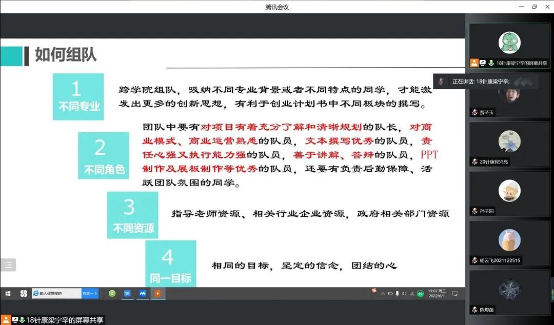 随后,梁宁辛向同学们讲解了组队的注意事项:一是建议跨专业、跨学院组队,这样可以吸纳不同专业背景或者不同特点的同学,能更好地激发出更多的创新思想,有利于创业计划书中不同板块的撰写;二是建议找能够相互配合的同学组队,使队内有不同的角色,比如在团队中要有对项目有着充分了解和清晰规划的队长,对商业模式、商业运营熟悉的队员,文本撰写优秀的队员,责任心强又执行能力强的队员,善于讲解、答辩的队员,PPT制作及展板制作等优秀的队员,负责后勤保障、活跃团队氛围的队员等等;三是利用好各种资源,例如指导老师资源、相关行业企业资源、政府相关部门资源等;四是队内要有同一目标,相同的目标、坚定的信念、团结的心可以让团队走得更远。