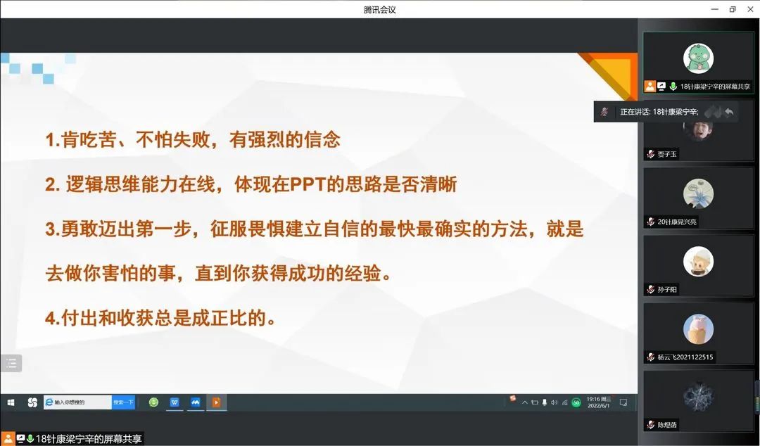 首先,梁宁辛向同学们讲述参加创新创业大赛的益处:一是不同专业的同学可以进行思想碰撞,锻炼逻辑思维能力;二是可以认识厉害的同学,结交志同道合的朋友;三是如果同学们未来有创业打算,通过比赛可以进行低成本的创新创业尝试;四是能够丰富大学经历和履历。梁宁辛还建议同学们参加各项比赛时要注重发挥个人主观能动性,提倡“放下比赛去比赛”,不建议同学们“为了参赛而去攒一个有效期到比赛结束的项目”,她希望同学们能真正的体会到科创的重要性和必要性,要真正的热爱科创,享受科创带来的收获和成就感。