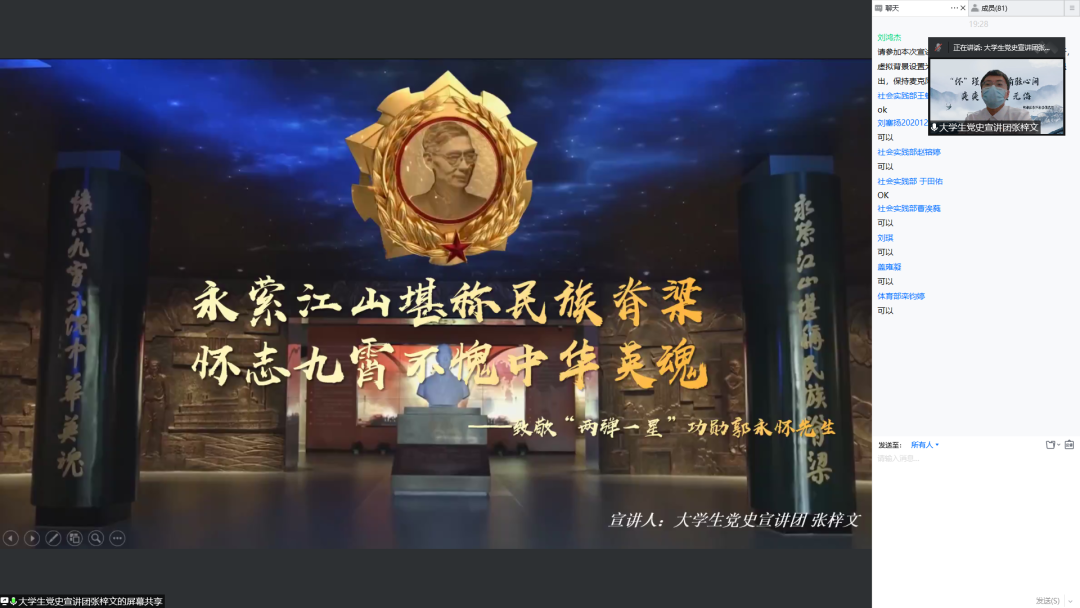 同学进行了“永萦江山堪称民族脊梁,怀志九霄不愧中华英魂——致敬‘两弹一星’功勋郭永怀先生”主题线上宣讲。宣讲围绕郭永怀先生的生平事迹分为四个部分。