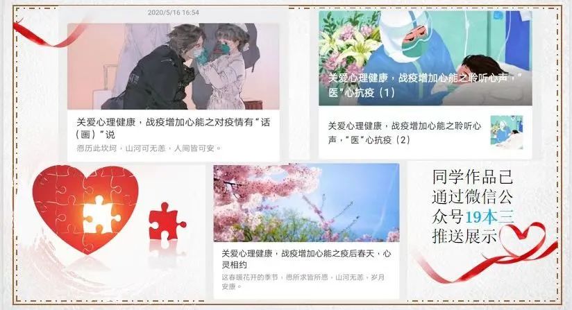 班级内开展了“疫路有你,向阳成长”系列活动,包含宣传普及心理健康教育知识讲座、“针推进宿舍,健康润心田”、“聆听心声,专项咨询”、班级微信公众号作品征集及展示、“关爱心理健康,战疫增加心能”主题班会。