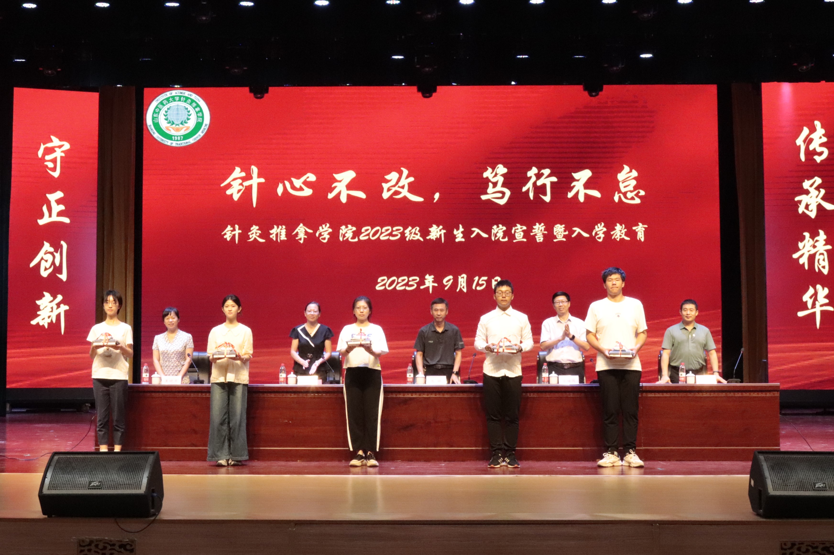 宣誓完毕后,学院领导、嘉宾向学生代表颁发学习用具——《针灸推拿学专业必背经典文献》、针具、米袋、针包。