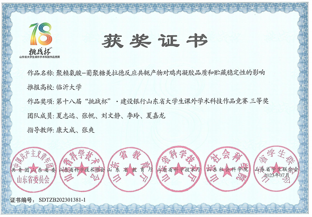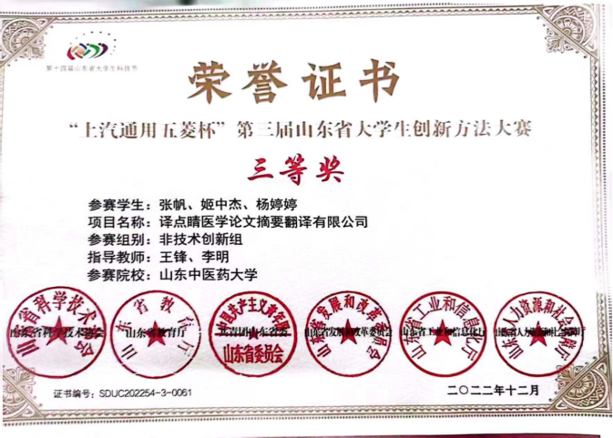 科研创新之路,固然充满了挑战和未知,但我对此有着浓厚兴趣。在探索的过程中,我不断尝试,敢于创新,勇于实践。因此,我参加了一系列的科创比赛,并在“互联网+”“挑战杯”、山东省大学生科创比赛中均获得了很好的成绩,同时发表了专业论文,这些荣誉不仅是对我的肯定,更是对我不懈努力的鼓励。然而,这些成就的背后,离不开我的导师的精心指导和团队成员的无私帮助。在科研的道路上,我深刻地体会到合作的力量。与团队成员共同研讨问题、分享发现,每一次讨论都是一次思维的碰撞,每一次实验都是对知识理解的深化。我们相互支持、共同进步,在科研的道路上携手前行。
