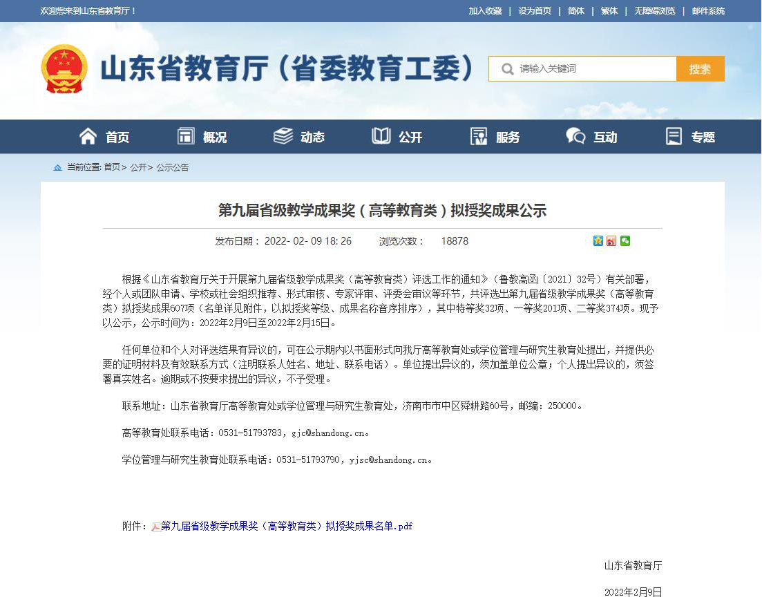 山东省教学成果奖每四年评选一次,旨在奖励和表彰全省各级各类学校和教师在教育教学改革和实践探索中取得的重要成果,是全省教育教学领域的最高奖项,也是反映学校教育教学水平的重要标志。本次获奖充分体现了学院在加强本科教学质量内涵建设、提高人才培养水平方面的整体实力。