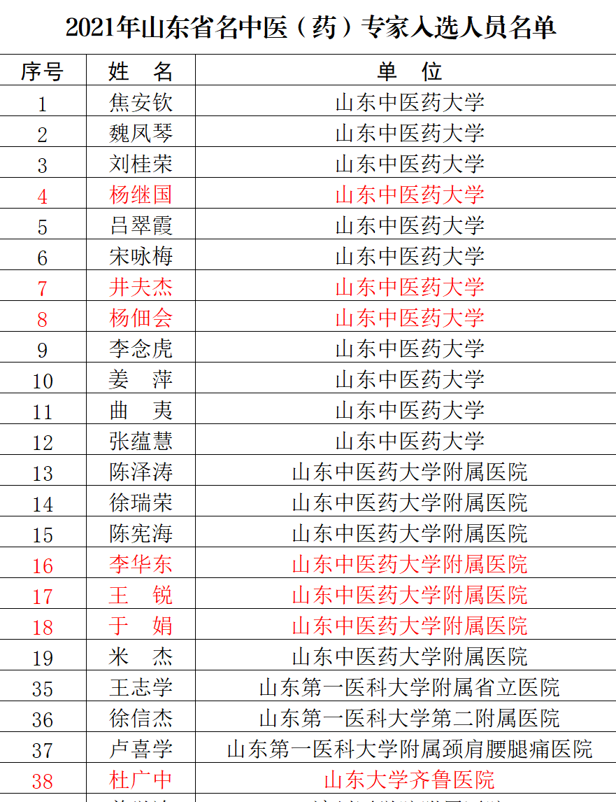 杨继国教授、井夫杰教授、杨佃会教授,附属医院针灸科王锐教授、推拿科李华东教授、小儿推拿中心于娟教授,齐鲁医院杜广中教授7人入选山东省名中医(药)专家。