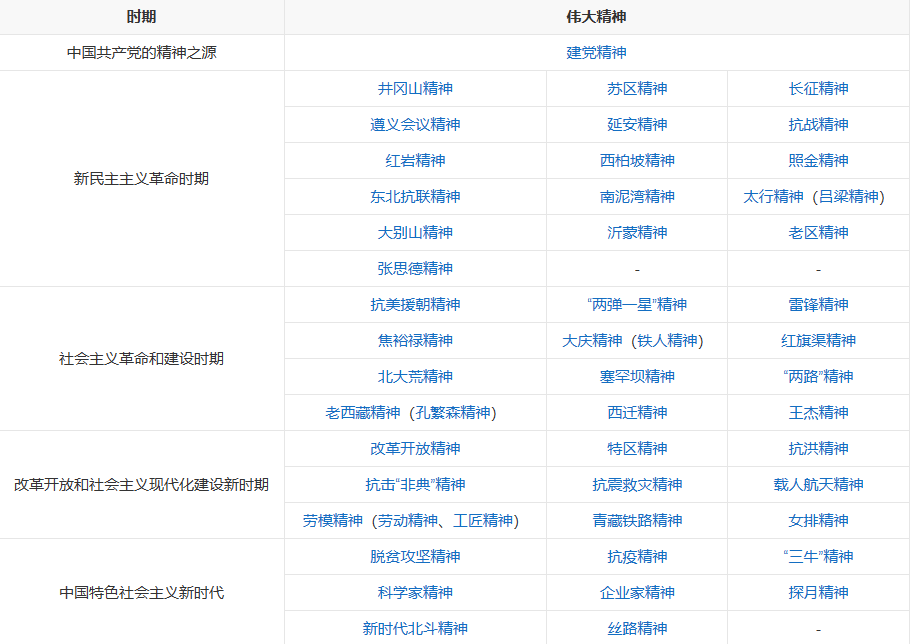 2021年建党百年前夕,党中央批准了中央宣传部梳理的第一批纳入中国共产党人精神谱系的伟大精神。这些精神,集中彰显了中华民族和中国人民长期以来形成的伟大创造精神、伟大奋斗精神、伟大团结精神、伟大梦想精神,彰显了一代又一代中国共产党人“为有牺牲多壮志,敢教日月换新天”的奋斗精神。