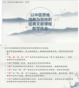 王健老师首先全面分析了“中医思维”的构成,分享了香山会议共识中“关于中医临床原创思维的意义及现状”,然后分析以中医思维培养为导向的经典文献课程设计与实施,提出“传统的针灸推拿学教育模式,目前已无法满足现代教育的快速发展,探究更高效率的教学方法,以期能够充分挖掘学生学习的潜能、提升学生的自学能力和创新意识,并培养医学生自主发现问题和解决实际问题的能力,是中医教育领域亟待解决的问题,基于此,经典文献课程在教学设计与实施中需以中医思维培养为导向”,结合《针推文献选读》课程情况,开展通过“理论 经典 临床”相结合“诵、解、别、明、彰”五步学习经典法。针对以中医思维培养为导向的经典文献课程评估体系,王老师提出,课程评估体系应围绕“激发学生“悟”的潜力,提升中医思维”,根据这样的目的,课程组织与运行“职责明确、分工负责、按级教学、环环相扣”。