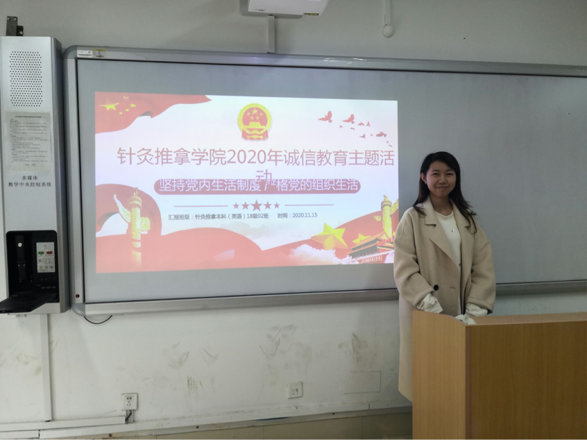 班会尾声,针灸推拿本科20级02班及针灸推拿本科19级03班等班级进行了诚信经典名言的诵读,加深了同学们对诚信的认识与了解。