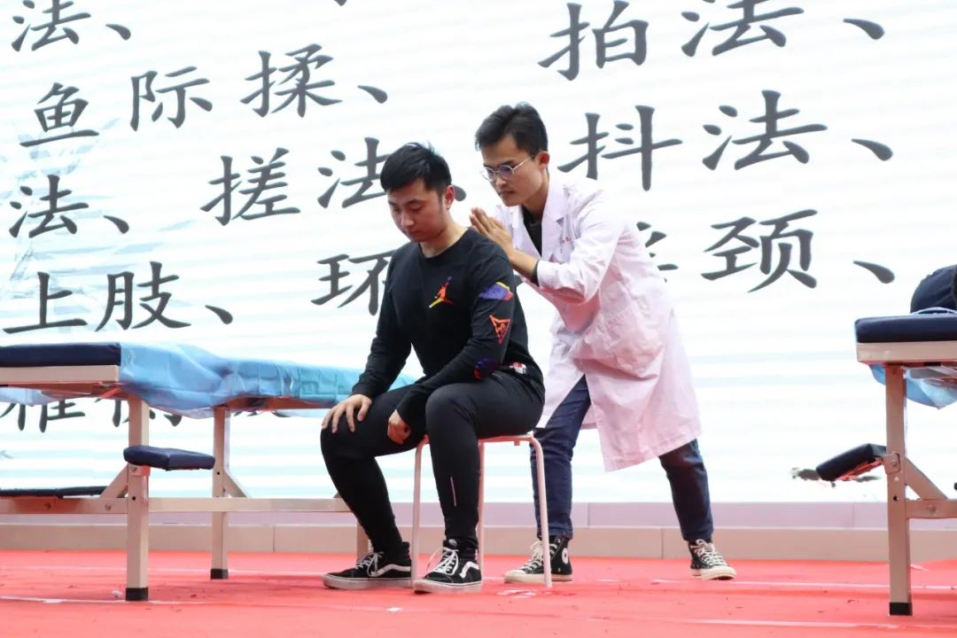 在推拿环节,各位选手根据老师选定的手法,一指禅法、大鱼际揉法、搓法......展示出他们熟练的推拿手法。