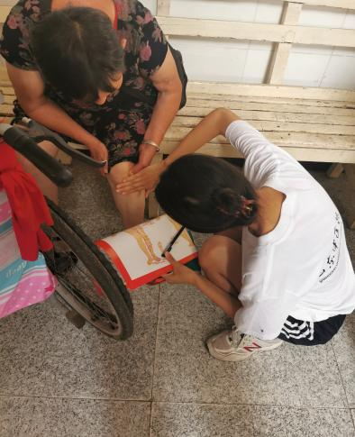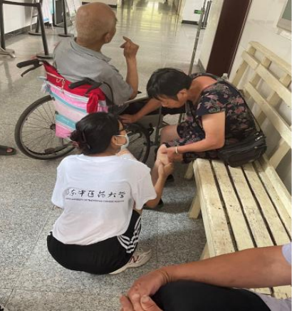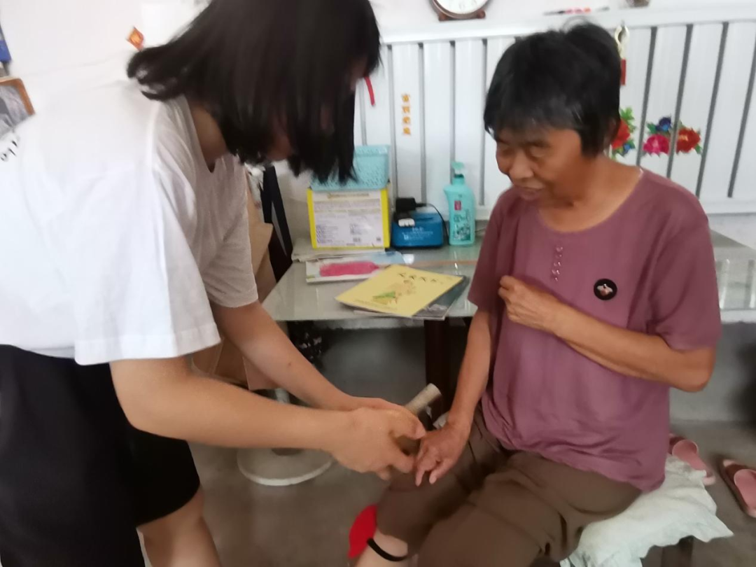 考虑到疫情防控要求以及部分村民行动不方便的问题,团队决定提供“健康送上门”服务。当队员在义诊过程中询问朱奶奶是否了解艾灸时,奶奶表示自己曾因吃不好饭而接受过艾灸治疗。奶奶撸起自己的裤子露出两腿外侧一些疤痕告诉队员说“这是之前烫伤留下的痕迹”。队员们推测,这是由于缺乏对艾灸治疗的正确认知而误治的结果。队员们随即贴心地为奶奶选用足三里穴来调理其胃部不适的情况。经过治疗后,朱奶奶表示“真神奇,热乎乎的也不烫,特别舒服”。看到奶奶舒展的表情,队员们心中感到无比喜悦。