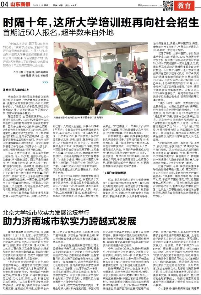 针灸推拿学专业1985年设立,2002年获博士学位授予权,现为博士后科研流动站设站学科,2020年获批国家一流专业建设点,就连世界卫生组织的拔罐标准都是由该学院制定。不仅如此,学校还是山东省保健按摩师指定的认证考试机构。此次备受关注的保健推拿培训班的创办要追溯到1999年。孔庆悦告诉记者,“培训班从创办至今,十几年得时间举办了98期,为社会培养了近万名保健按摩师。”后来,受限于国家政策调整等原因,该培训班从2013年起便停办了,期间不断有各地市民给学校打来咨询电话,咨询何时能再次重启教学。