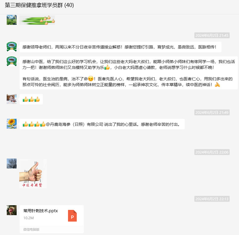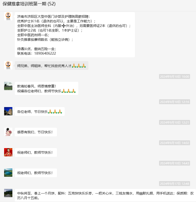 第十期保健推拿培训班:2025年4月21日-4月30日(10天),人数上限30人,4月16日之前交费报名,可以免费参加五一假期中医外治适宜技术(针灸)培训班(如需证书额外付费)。