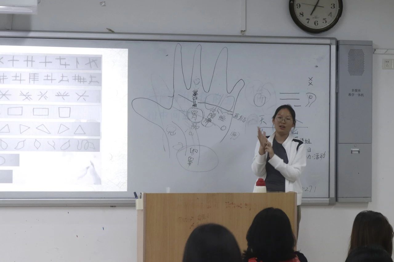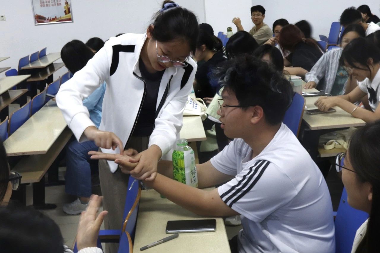 李天乐在讲解完手诊的理论知识后,鼓励同学们付诸实践,互相观察手相,同时,她也手把手指导同学们分辨掌纹的差异。